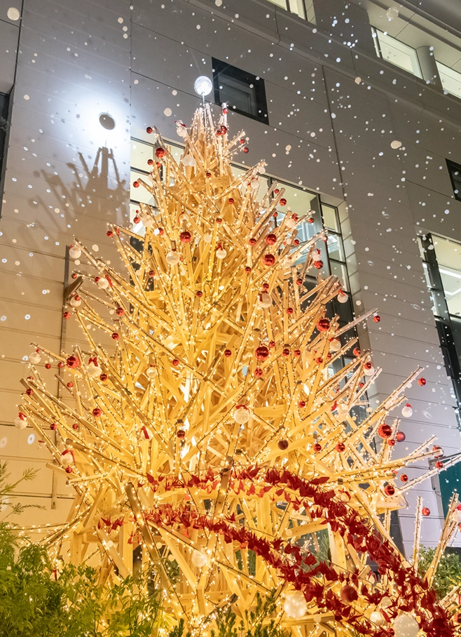 今回のメインツリーには、弊社で、山林保全の一環として伐採した間伐材が使われました。大丸のデザイナーさんに入っていただき、森の資源を無駄にしない循環のデザインとして、木の温もりを生かしたツリーが制作されました。
