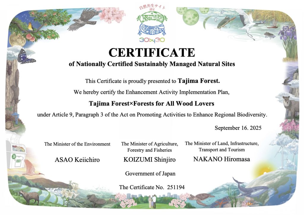 In September 2025, Tajima Forest × Forests for All Wood Lovers was officially certified by the government of Japan as a “Nationally Certified Sustainably Managed Natural Site”.